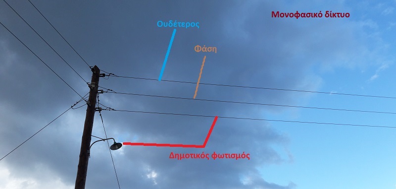 Πλην μερικών απόμακρων κατοικιών οι οποίες έχουν τροφοδοτηθεί με μονοφασικό ρεύμα και επειδή σε αυτό το σημείο δεν έχει ζήτηση από κάποιον καταναλωτή για τριφασικό, τότε ο ΔΕΔΔΗΕ κάνει τσιγκουνιές στα καλώδια και μας φέρνει μόνο 3! Δηλαδή Φάση, ουδέτερο και οδοφωτισμό!
