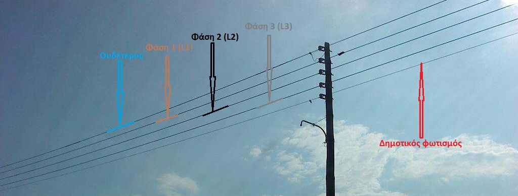 Στην Αττική, θα έχουμε παρατηρήσει τις κολώνες οι οποίες μοιράζουν το ρεύμα στους καταναλωτές. Αυτές (της χαμηλής τάσης 230-400v) θα τις συναντήσουμε σε κάθε στενό, δρόμο, λεωφόρο και κάθε σημείο της πόλης. Αν παρατηρήσετε, από αυτές τις κολώνες περνούν 4 καλώδια συν του οδοφωτισμού, συνολικά πέντε. 3 φάσεις, ο ουδέτερος και ο οδοφωτισμός.