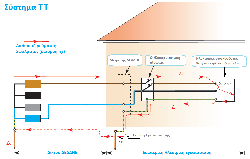 Έχει όμως σχέση με τα κουτιά του ΔΕΔΔΗΕ. Εκεί κάτω στα υπόγεια της πολυκατοικίας ή εκεί όπου συνδέεται ο πάροχος με τον καταναλωτή σε μονοκατοικίες ή καταστήματα ή παντού…. Στους μετρητές της ΔΕΗ που έχουμε συνηθίσει να λέμε, εκεί λοιπόν μπαίνει η γείωση από το έδαφος και τερματίζεται στο κουτί της ΔΕΗ σε ένα μπαράκι γείωσης. Εκεί λοιπόν καταλήγει και η γείωση από το διαμέρισμα – κατάστημα κλπ. Αυτό είναι σύστημα ΤΤ. Πιο απλά είναι η γείωση που κατασκευάζει ο καταναλωτής και αφορά την προστασία του. Ο πάροχος λοιπόν, δεν αναλαμβάνει καμία προστασία απέναντι στον καταναλωτή.