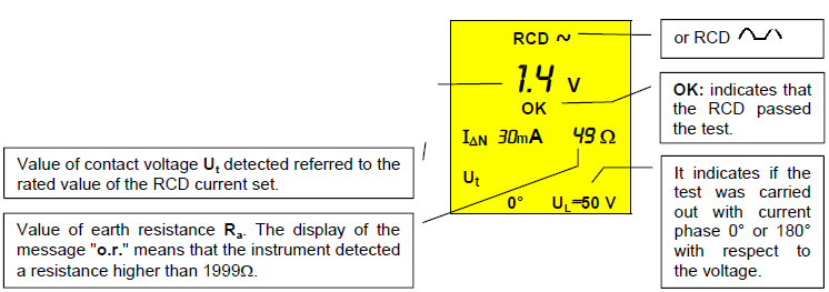 - Αν το RCD δεν κάνει απόζευξη τότε η δοκιμή θεωρείται επιτυχής και το όργανο εκπέμπιε ένα διπλό ηχητικό σήμα και μας δείχνει την παρακάτω οθόνη.